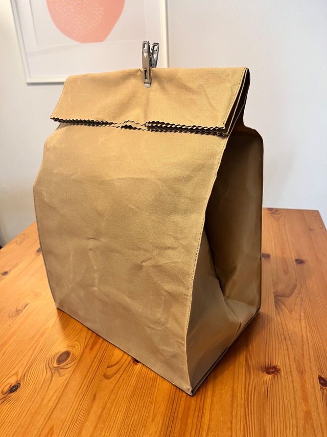 【Spoonful/スプーンフル】 ランチバッグ 価格:¥2,800(+tax) サイズ:高さ34幅20 奥行き14cm 容量: 10L 重量:約 100g 材質 : キャンバス(パラフィン加工)、クリップ(アルミ) MADE IN JAPAN まるで紙袋のようなランチバッグ。 パラフィンコットンキャンバスを使用することで、使う毎にあじが出てくる仕様になってます。(パラフィン加工が落ちてしまうので丸洗いは避け汚れた際は濡れた布巾で拭いてください) 一般的な弁当箱がボトムサイズにちょうど収まる寸法で、ギフトラッピングや鉢カバーやインテリアに使われるのもオススメです。