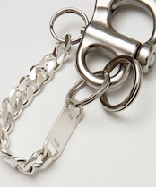 ヨット等で使用されるスナップシャックルに、シルバーのチャームなどを組み合わせたキーリング。太幅のキヘイチェーンとIDプレートを繋げたチャームはシルバー925、シャックルはステンレス、Wリングは鉄という異素材で構成されています。