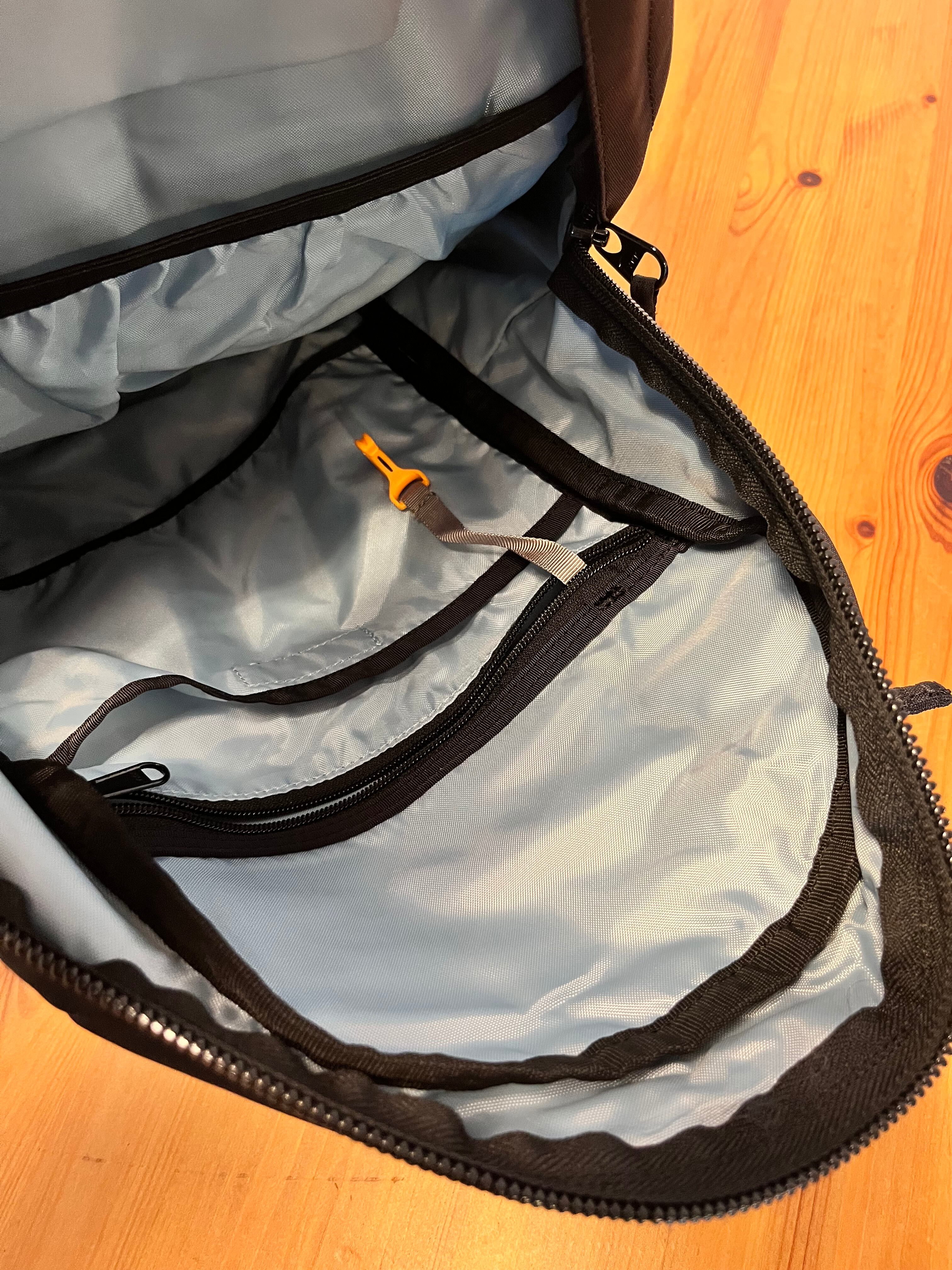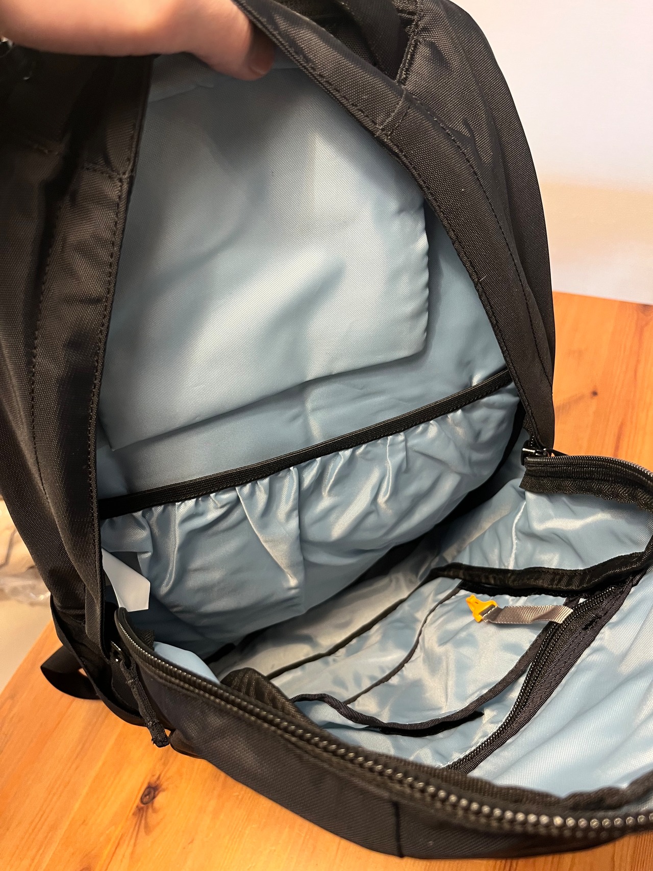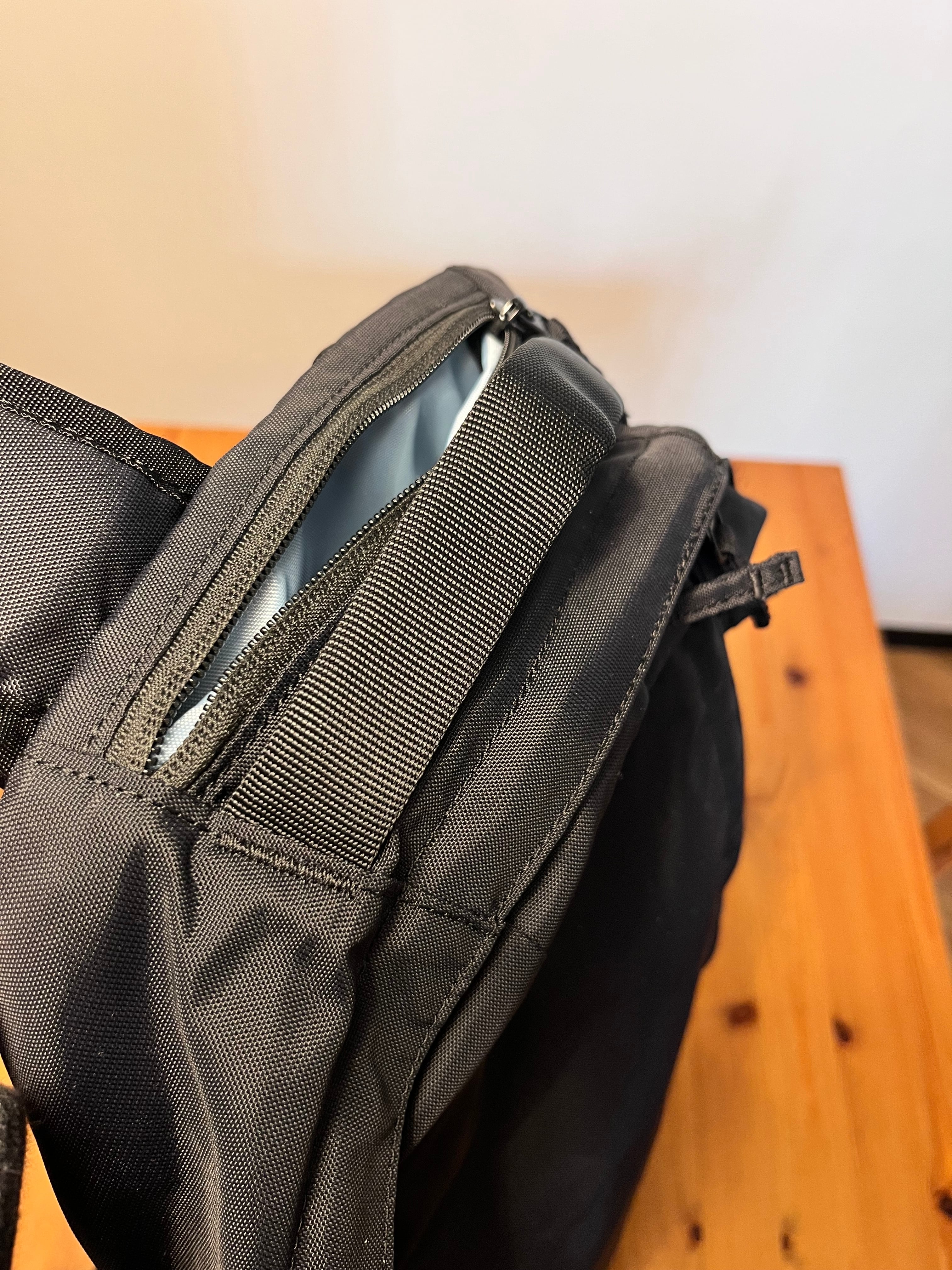 上面にはミニポケットがあり、前に背負って電車に乗る際にスマホの避難先として重宝します。