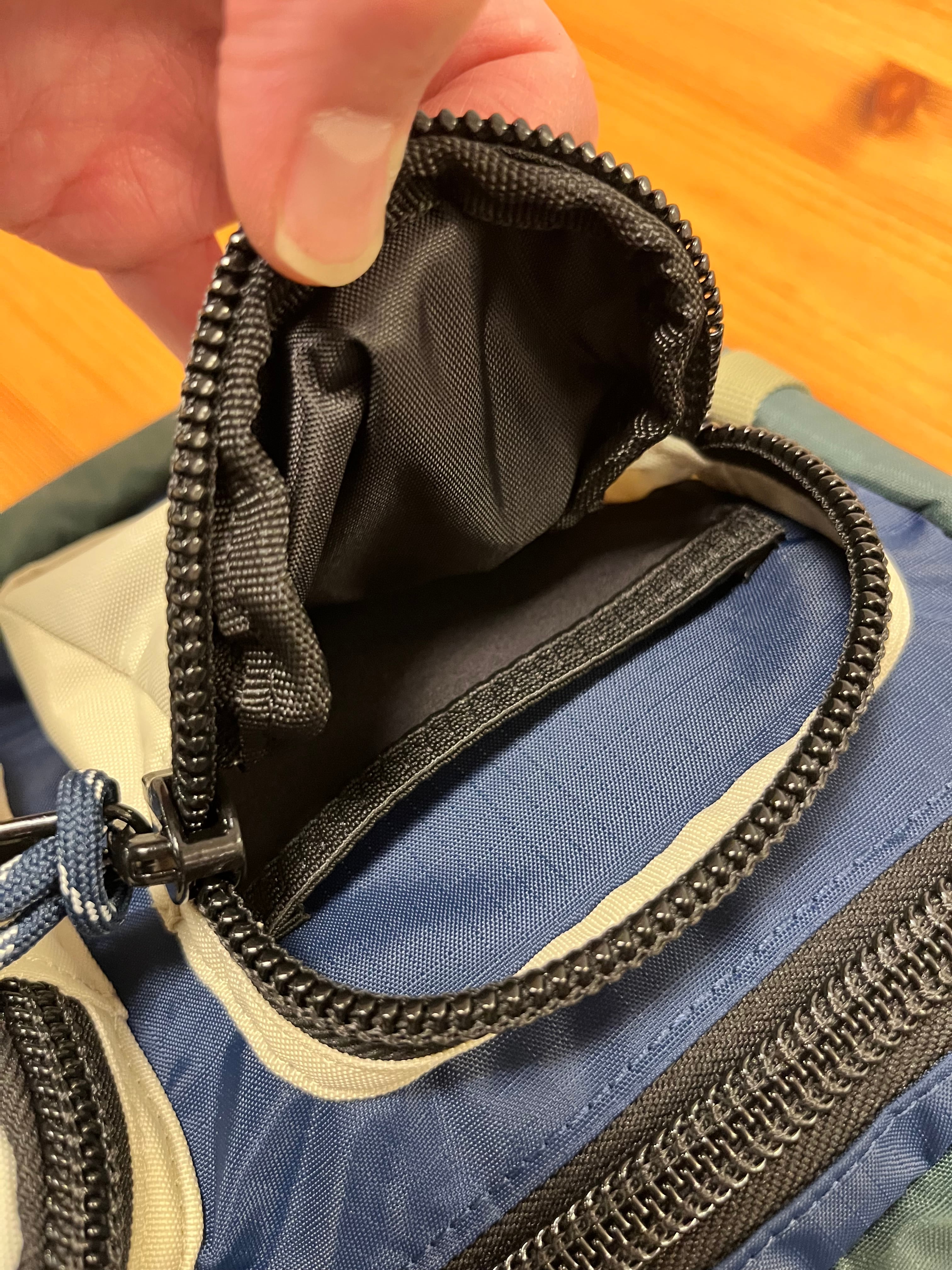 前面2つの独立したポケット、さらにその後ろに大きめポケットがあり小物も収納しやすく、ナイロンで軽く旅行やアウトドアにも相性抜群です。